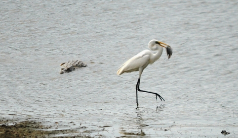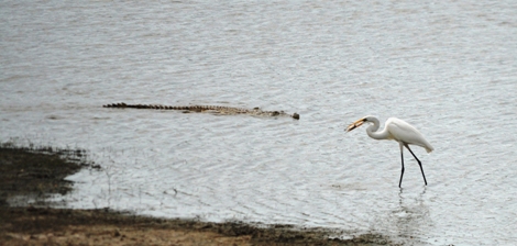 He legged it and the croc decided not to chase after the quick-footed bird. A croc this big has more than enough experience to know that when a great egret decides to run for it, there's no point chasing after competition that can fly.