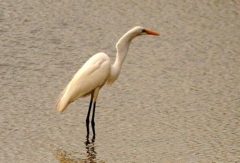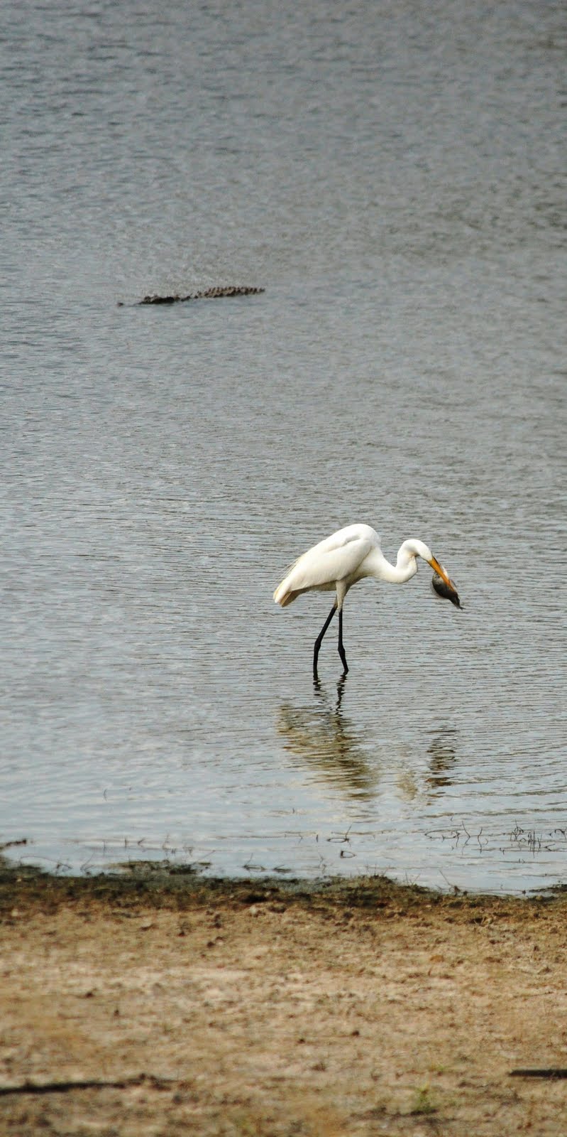 The egret waded into the lake with the fish in its mouth, trying to flip it around so that he could swallow it whole, as egrets are want to do with their catch. Meanwhile, the croc kicked off the bank and slid out into the water.