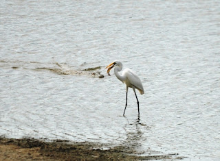 A stern look told the punk to stay away. The egret quickly thrust his head back into the water and popped out again, the fish securely in his beak. The heron couldn't do much more than look on in disappointment.