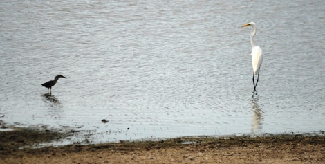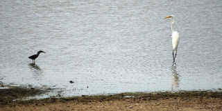 The Striated Heron thought he might be able to pull a fast one and started to lunge in after the dropped fish. But the much bigger egret wasn't taking any of the little guy's nonsense.