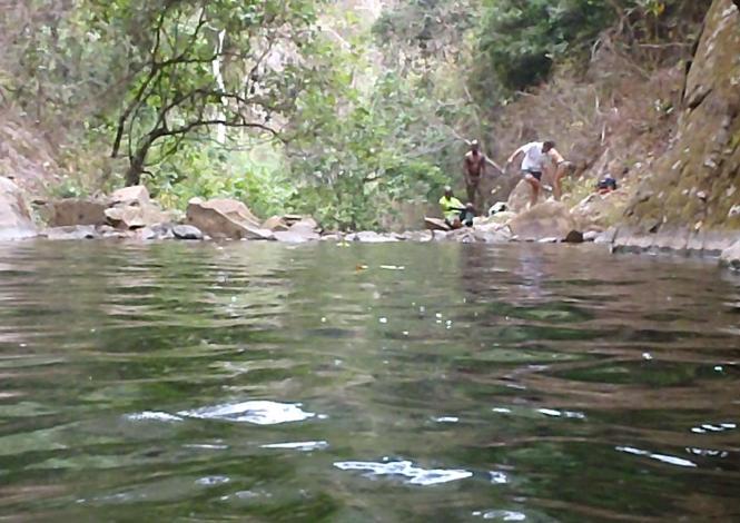 Here he is taking the plunge at the waterfall pool.