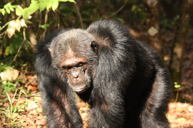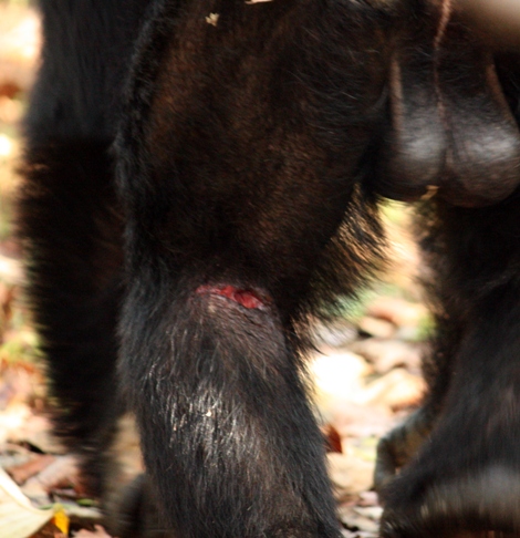 Only 10 minutes walk from the sight we encountered several chimpanzees grooming on the path. Two ringleaders of the assault, Alofu and Kalunde, were there and looked completely relaxed. It now seems that Alofu has regained his Alpha male status nearly 4 years after he lost it to Pimu.