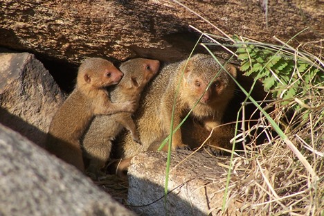 Whilst this Dwarf Mongoose pack has around 15 individuals it is only the dominant male and female mongoose that breed, though the other pack members help feed and care for the offspring.
