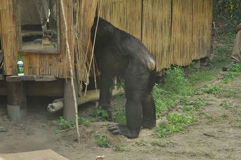 Another few looks in the mirror and Michio decided to do a more thorough inspection on the other side of the chefs room. Basically pulling apart the wall and sticking half his body through (!), he inspected another time. He then looked puzzled again, walked away for a couple of meters – and although not on picture – he carefully checked underneath the building to see if any chimpanzee feet were present!!