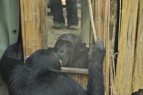 As a big group of chimpanzees came rather unexpected through camp, hair clipping of our head chef was abruptly halted when Michio saw the mirror. Walking towards it he screamed when he saw himself – doubting who it was. As he came closer he inspected the mirror, pulled faces and kissed the mirror.