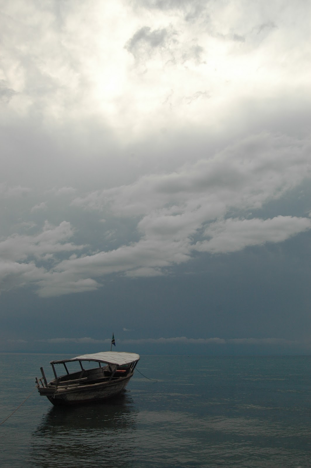 At 7.45am after checking the camp one last time Wolfie departed. We wont be back for 5 weeks so it was kind of sad watching Greystoke slip out of sight. The lake was nice and calm but we could see huge storm clouds gathering in the North and guess which way the wind was coming! After 1 hour plain sailing the storm was upon us. At this time of the year the weather on Lake Tanganyika can be very unpredictable; being such a large body of water it creates its own environment. Within 5 minutes the lake went from tranquil and relaxing to 3 foot white capped waves, strong winds and heavy rain. One minute we could see the Congo 50 km across the lake then we couldnt see 20 meters in front of the boat. Luckily we were heading straight into the waves which helped ease the rocking but did mean the bow was thumping into each new wave and slowing our passage considerably. Our canvas roof was virtually useless as rain and spray blew vertically soaking everything and everyone.