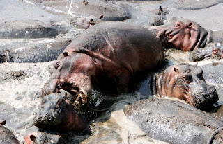 Katavi hippos are tough, as I said. They take the full strength of the sun on their backs, a feat which would kill other hippos in a week. They walk for miles every night eating dried leaves and...more dried leaves. They "petition" for a slot in the mud bog among hundreds of packed, mud-caked, parched bodies, often fighting viciously, sometimes to the death. Even when the rains finally fall and the river flows full again, their fighting just intensifies because they have renewed energy and territories to re-establish and ladies to impress and genes to pass on.