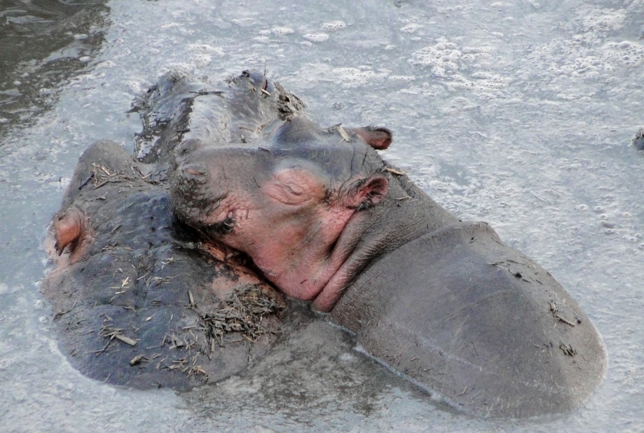 Poor guy actually did get in a fight, or should we say lucky guy. Can't say for sure but it looks like he lost the fight, since his flanks took the brunt of the attack, meaning he tried to run away while his opponent kept slashing at him. Even young and female hippos have scarred backs because hippo society can be a rough place to fit into at times, but they seem to recover well in most cases. This one's wounds seem quite superficial, actually. Sometimes they kill each other.