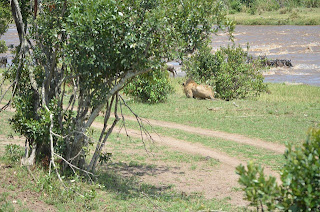 Maria and Nestor Gallione shot these great pictures on the Mara river banks yesterday. The green back ground, the massive amounts of water in the river and wildebeests trying to cross all adds up to a great sight. And what about the lion waiting at the river bank, ready to welcome the wildebeest? Hiding behind a far too small bush the lion didn’t attack in the end, but the scene looks amazing.