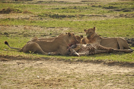 As it kept facing the river, four lionesses came shooting out of the tree line. At a speed that was next to unbelievable, the lions jumped literally on top of the young giraffe. Two at the back and two biting the young animal in the neck – it was over within the blink of an eye.