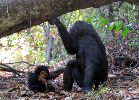 Which is why our guests at Mahale, the Marks family from Oxfordshire, were so thrilled to see almost identical behaviour among our very own community of wild chimpanzees. Tani, one of our females, broke off the thick stem of a forest leaf and poked it into a hole in the trunk of a fallen tree to attract a tasty meal of live ants. She then demonstrated the technique to her young son, Ckriti, who got the hang of the idea in no time at all as the pair settled down together for a tasty snack. That’s mah boy, indeed!