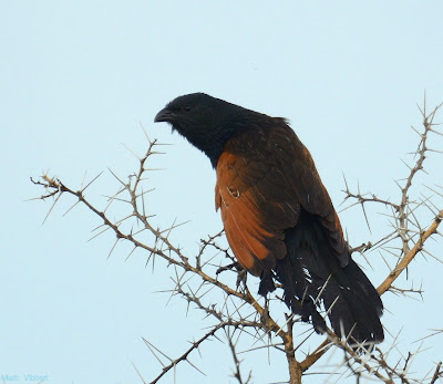 Scanning the Chada plain beyond the hornbill, we can easily spot this Black Coucal, contrasting its surroundings in its striking, seasonal breeding plumage.