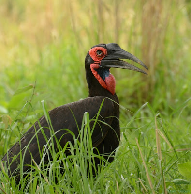 Peering out from camp to the edge of the grassland, we see a Southern Ground Hornbill on a stroll of her own. The lovely blue throat patch is a female characteristic.